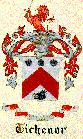 According to John Matthews, Complete American Armoury and Blue Book, Heraldic Publishing Company, (1965), the Boars Head Arms was the Arms of William Ticknor - Boston, 1646 and Scituate, Mass, 1856. No other detail is given, however, no connection between Ticknor and Martin Tichenor or any other Tichenor line is known. It may be that Ruth Garrard when researching for the Tichenor Coat of Arms utilized the Boar’s Head concluding that Tichenor was a variation of Ticknor or vice versa. If the Tichenor name is a place or habitation name derived from Itcheon, England, a pronouncing with a hard ck - as in tick, instead of the soft ch as in church would not be consistent with how Itcheon is now pronounced in England, as it is not pronounced as Itkeon, but with the soft ch - church sound.